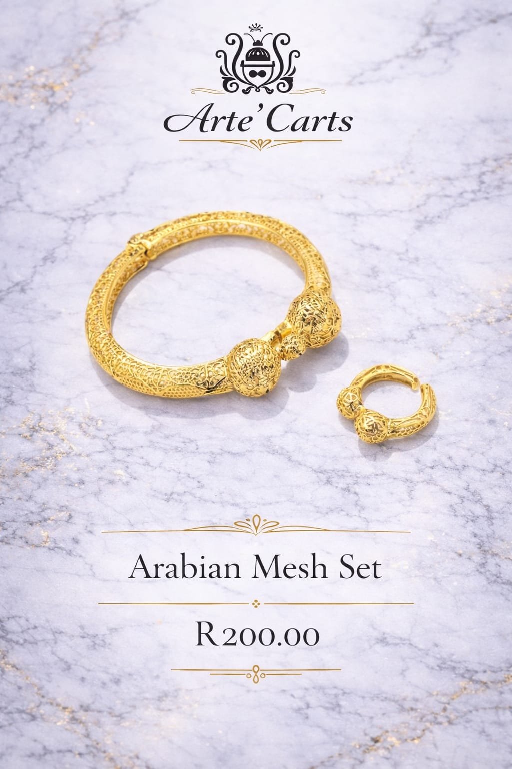 The Arabian Mesh Set features a beautifully detailed bangle paired with a matching textured ring, designed with intricate mesh-style patterns and sculpted centre accents. The rich gold-tone finish and ornate detailing give this set a classic, heritage-inspired feel.