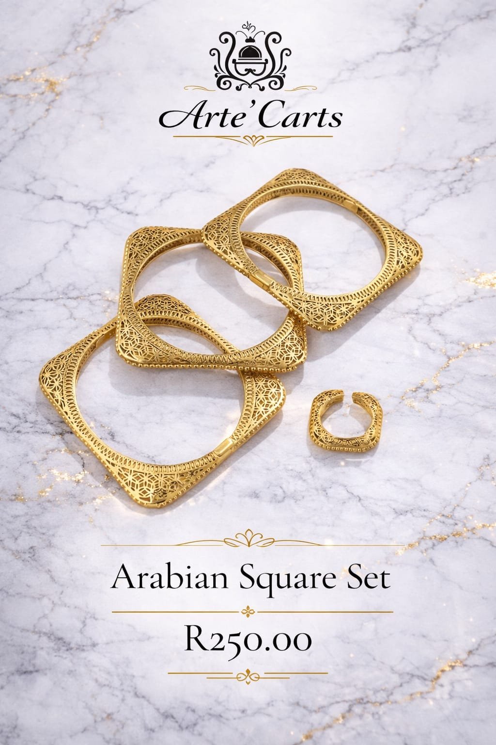 The Arabian Square Set features beautifully detailed square bangles paired with a matching textured ring, designed to create a striking yet sophisticated look. The intricate filigree-style patterns add depth and character, while the structured square silhouette gives the set a modern edge.
