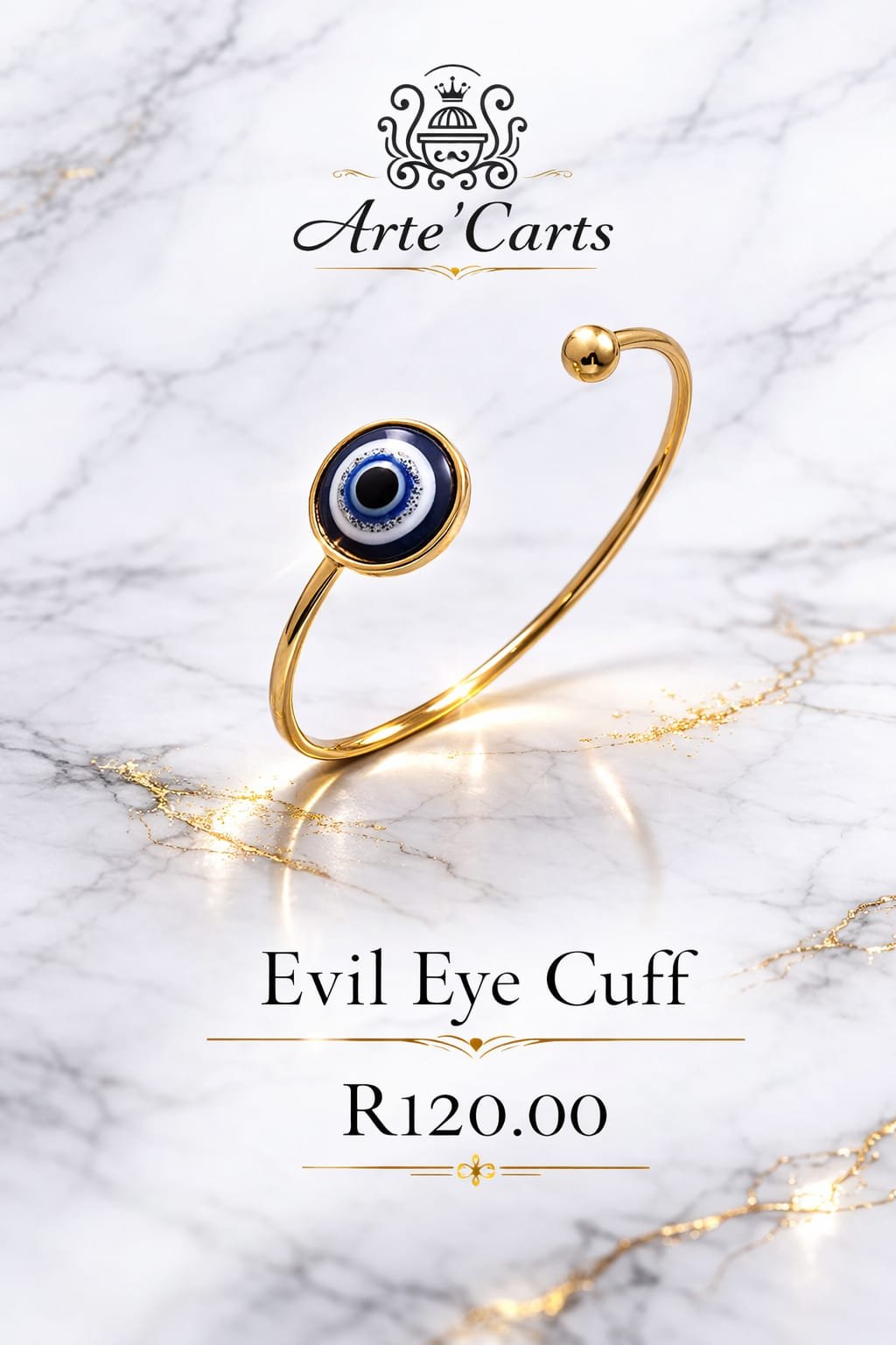 The Evil Eye Cuff features a sleek gold-tone open bangle design accented with a striking evil eye centrepiece. Minimal in structure yet powerful in meaning, this piece blends modern elegance with timeless symbolism.