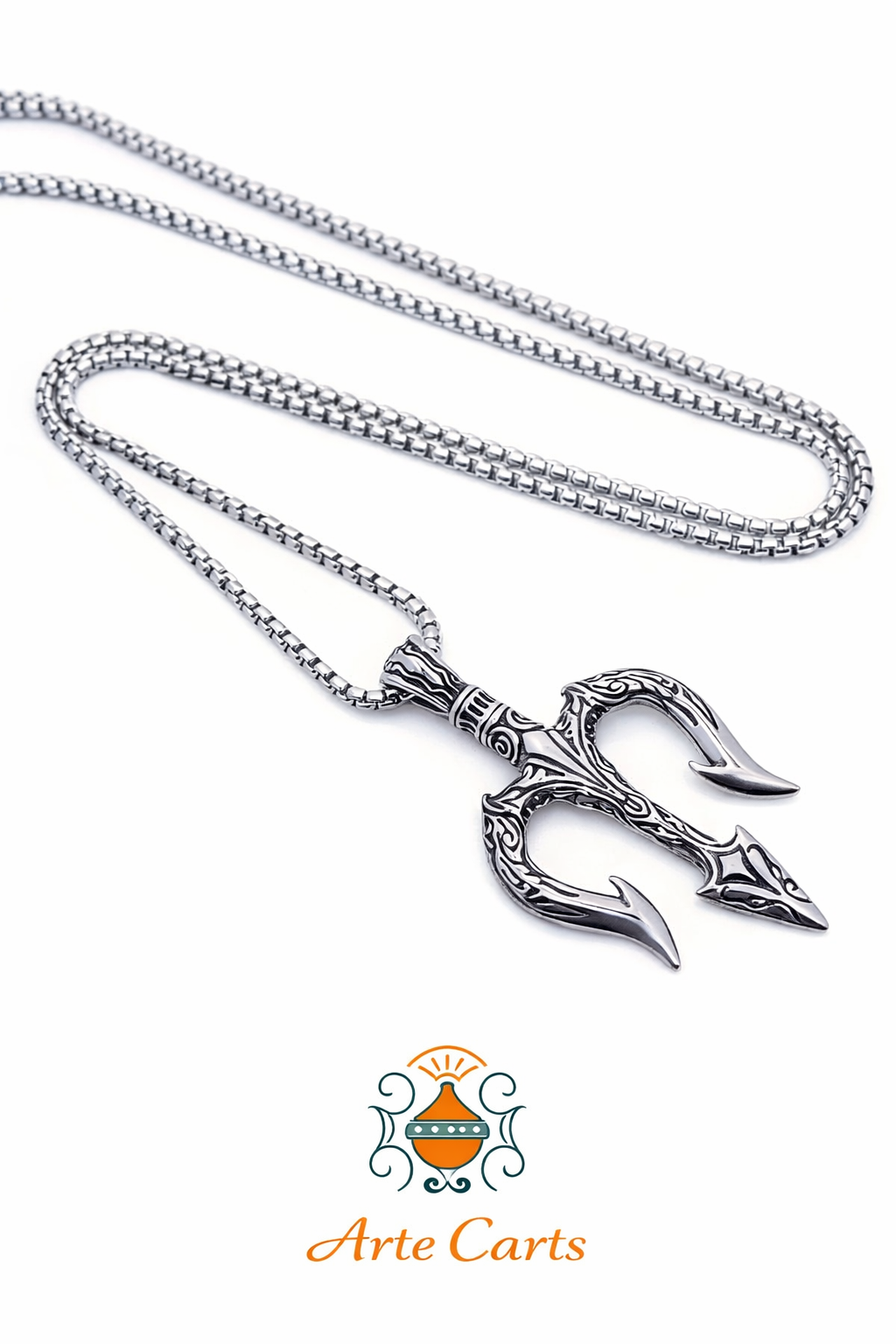 The Trident Amulet Pendant Necklace features a striking trident design inspired by ancient mythology and warrior symbolism. The detailed silver-tone pendant represents strength, protection, and authority, making it a bold statement piece for those who appreciate powerful symbolism and unique jewellery.