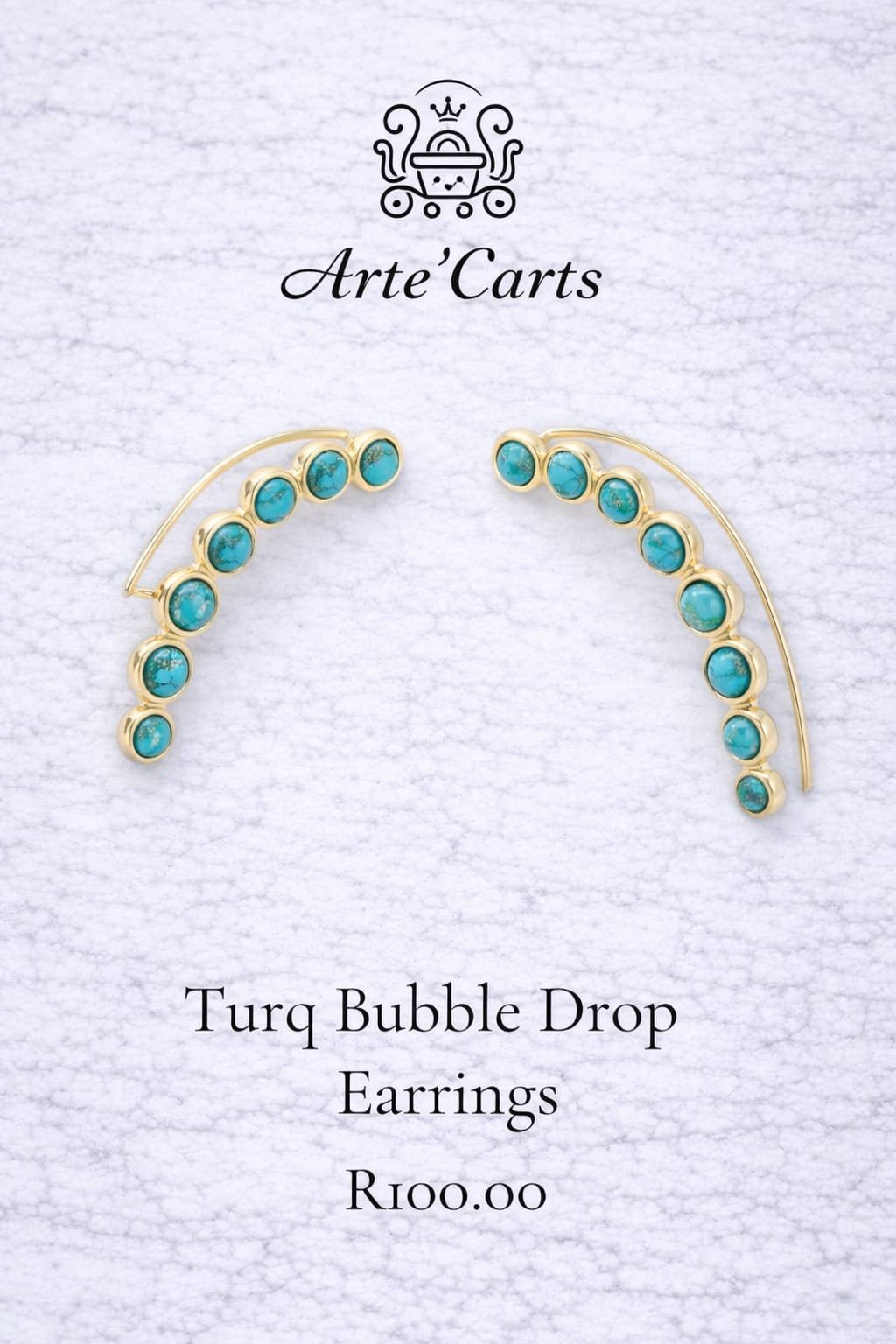 The Turq Bubble Drop Earrings feature a curved drop design lined with turquoise-inspired stones set in a smooth gold-tone frame. The gentle arc creates a flattering silhouette that follows the natural contour of the ear, making them bold yet refined.